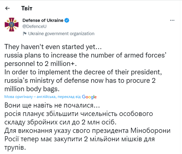 "Вони ще навіть не почали... Росія планує збільшити чисельність особового складу збройних сил до 2 мільйонів осіб. Для того, щоб виконати указ президента, Міністерство оборони Росії має закупити 2 мільйони мішків для трупів", — заявили у відомстві.