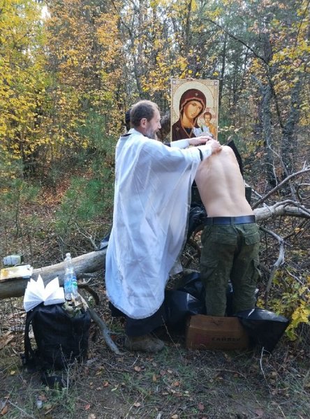 У солдатів не виявилося тазика, який зазвичай використовують для обряду, тому протоієрей звернувся до підручних засобів: ящика для боєприпасів і пакетів для трупів. Він вважає, що вийшло символічно.