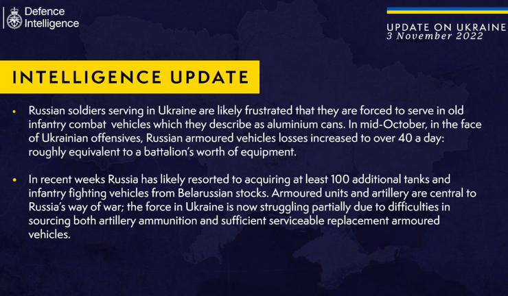 У середині жовтня під час наступу Збройних сил України російська армія втрачала 40 одиниць броньованої техніки на день. Це приблизно дорівнює кількості техніки одного батальйону. Про це повідомляє розвідка Великої Британії.