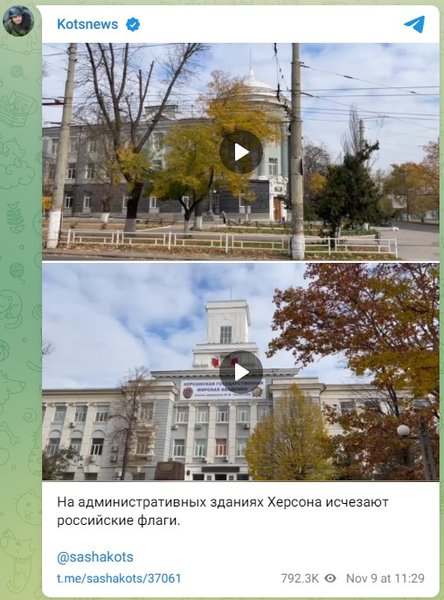 "Судячи зі знятих прапорів з адміністративних будівель Херсона, Росія все ж таки залишає Херсон, про що вже повідомили наші провідні канали. Раніше ключовою датою кулуарно позначали 10 листопада — дату, до якої російські підрозділи повинні залишити столицю суб'єкта", — написав "військор".