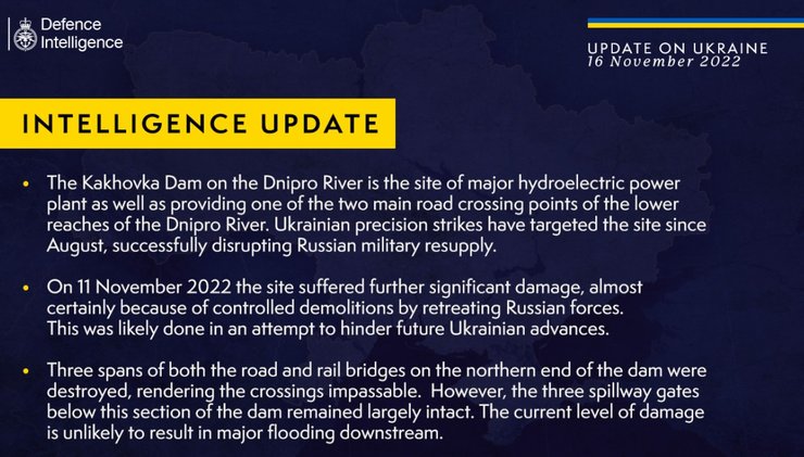 За даними британської розвідки, росіяни зруйнували три прольоти автомобільного та залізничного мостів на північному кінці греблі, через що переправи стали непрохідними. "Ймовірно, це було зроблено у спробі перешкодити майбутньому просуванню українських військ", — йдеться у повідомленні британського відомства.