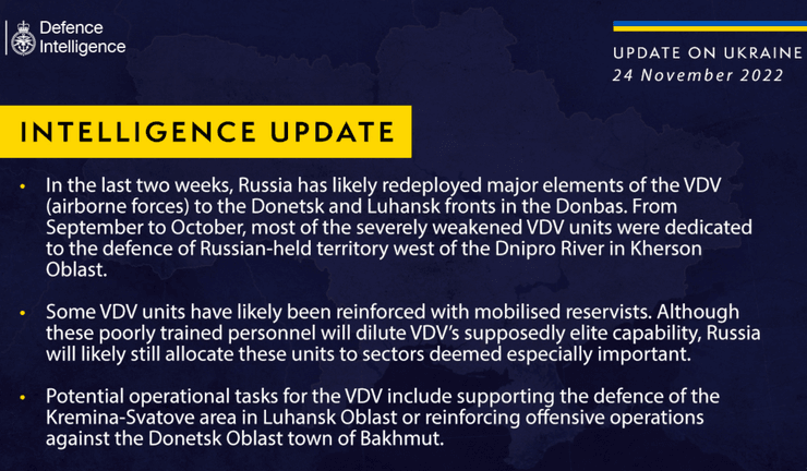 За останні два тижні Росія, ймовірно, передислокувала основні підрозділи Повітряно-десантних сил, які концентрувалися на Херсонському напрямку, на фронт Донецької та Луганської області. Про це розповіли в розвідці Великобританії 24 листопада.