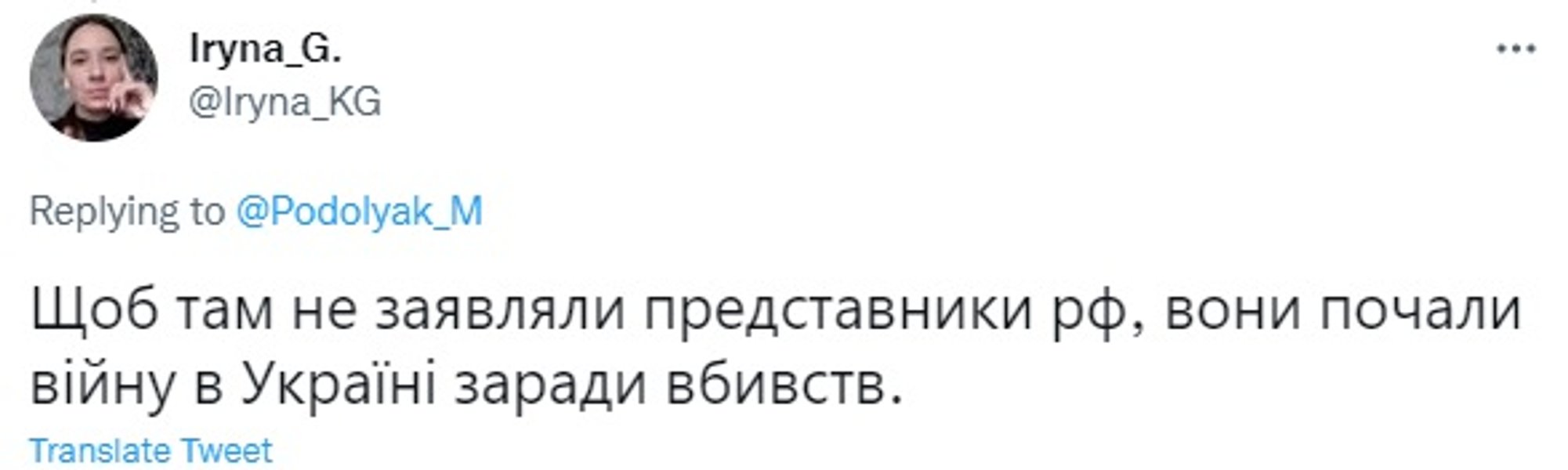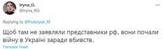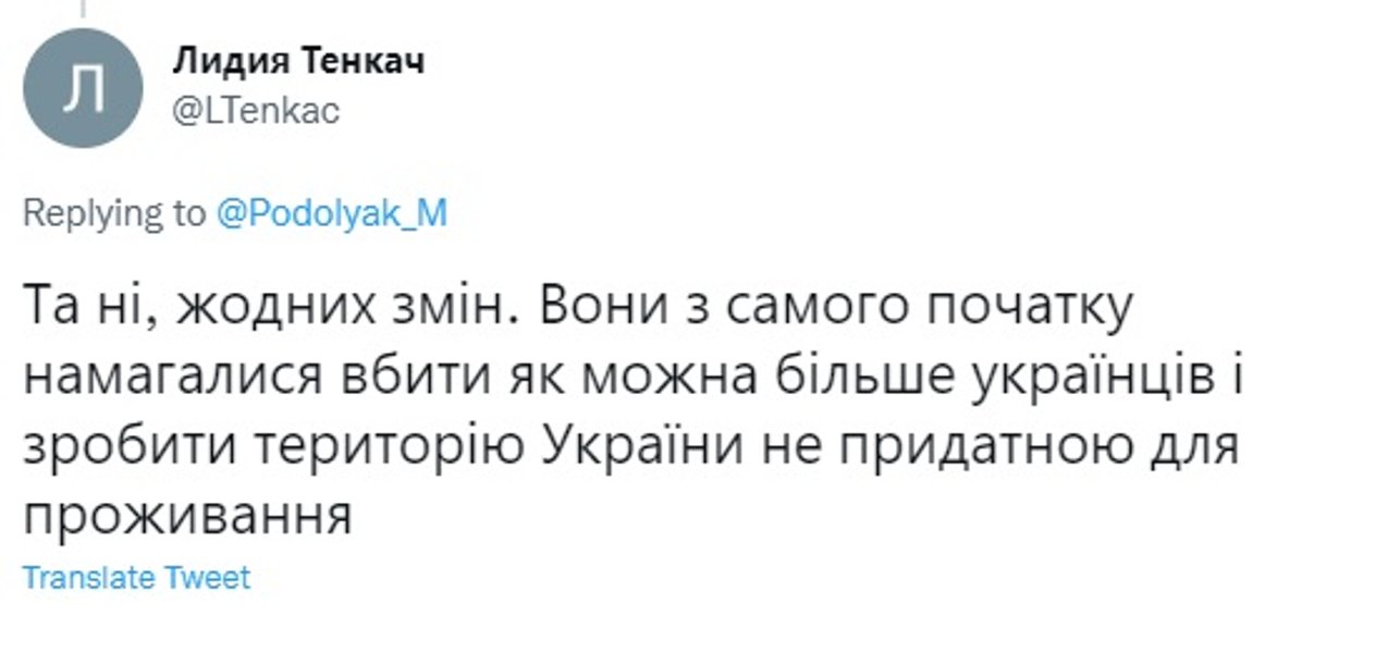 "Та ні, жодних змін. Вони із самого початку намагалися вбити якнайбільше українців і зробити територію України непридатною для проживання", "Цей факт має зняти будь-які обмеження щодо ведення бойових дій із захисту та звільнення України, не можна обмежувати себе у способах захисту та ударів у відповідь! Затиснути тільки коліна, а не вдарити ґвалтівника в пах – це не спосіб захисту", "Щоб там не заявляли представники РФ, вони почали війну в Україні заради вбивств".