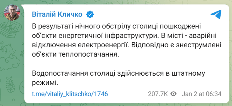 Зазначимо, 2 січня мер Києва Віталій Кличко повідомив, що іранські дрони Shahed атакували інфраструктуру столиці та пошкодили енергетичні об'єкти. Внаслідок чого у деяких будинках не було опалення, а також діяли аварійні відключення електрики.