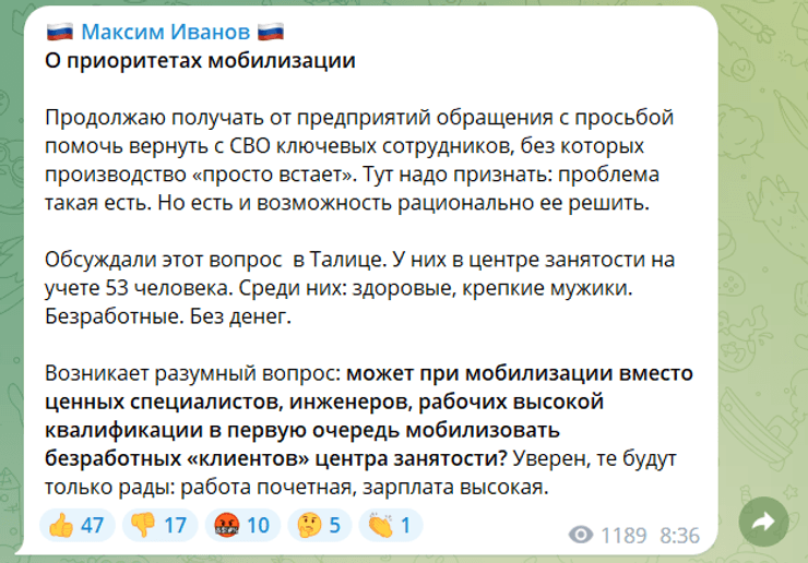 "Може при мобілізації замість цінних фахівців, інженерів, робітників високої кваліфікації насамперед мобілізувати безробітних "клієнтів" центру зайнятості? Упевнений, ті будуть лише раді: робота почесна, висока зарплата", — написав він.