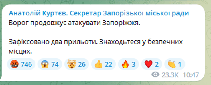 О 10:47 секретар Запорізької міськради Анатолій Куртєв повідомив про те, що у місті зафіксовано два "прильоти".