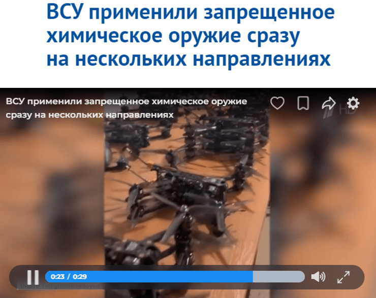 На відео, де зафіксовано застосування хімічної зброї, видно зйомку з дрона: кілька російських військових борсаються в каналі, після чого на них падає боєприпас. Пропагандисти запевняють, що цих військових нібито атакували гранатою з хімічною речовиною, що призвело до задухи та дезорієнтації солдатів.