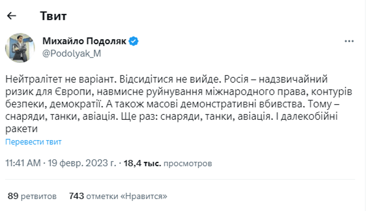 "Нейтралітет не варіант. Відсидітися не вийде. Росія — надзвичайний ризик для Європи, навмисне руйнування міжнародної правди, контурів безпеки, демократії. А також масові демонстративні вбивства", — написав Подоляк.