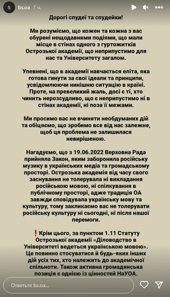 Острозька академія раніше не підтримувала ні викладання російською мовою, ні спілкування нею в публічному просторі, нагадали студенти.