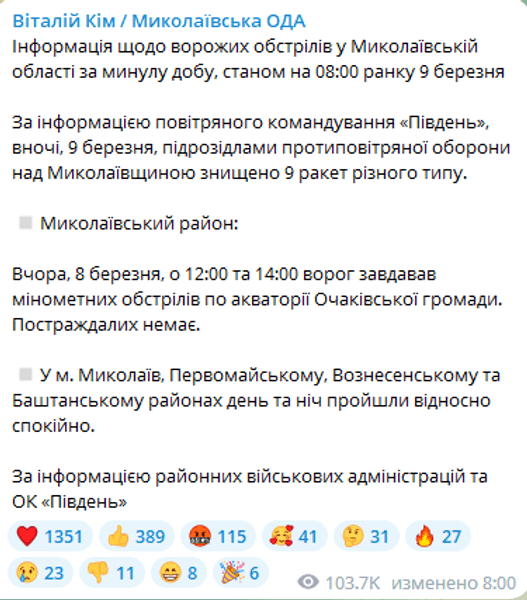 Глава Миколаївської ОДА Віталій Кім 9 березня повідомив, що над областю збили 9 ворожих ракет.