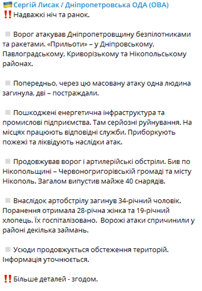 Голова Дніпропетровської ОДА Сергій Лисак повідомив, що регіон був атакований безпілотниками та ракетами. Попередньо відомо, що одна людина загинула, ще двоє отримали поранення різного ступеня важкості. Є попадання в об'єкти енергетичної інфраструктури та промислові підприємства. Над областю збили 7 ракет.