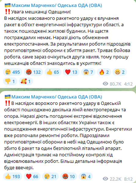 Голова Одеської ОДА Максим Марченко повідомив, що внаслідок ракетного удару пошкоджено кілька ліній електропередач та опору. В області запровадили погодинні екстрені відключення світла. Бригади енергетиків уже розпочали ремонтні роботи.