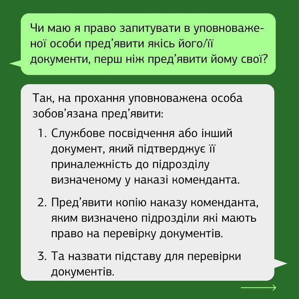 Співробітники ТЦК (військкоматів) не мають права зупиняти громадян на вулиці для перевірки документів та уточнення їх особистих даних, щоб видати повістку, стверджують у Координаційному центрі безкоштовної правової допомоги. Перевірити документ, що засвідчує особу, можуть лише працівники поліції, СБУ, Нацгвардії, Держприкордонслужби, митниці, міграційної служби, а також службовці Збройних сил України, визначені указом коменданта.