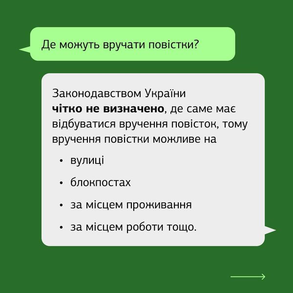 При цьому юристи Безкоштовної правової допомоги зазначають, що законодавство України чітко не визначає місця, де можуть вручати повістки.