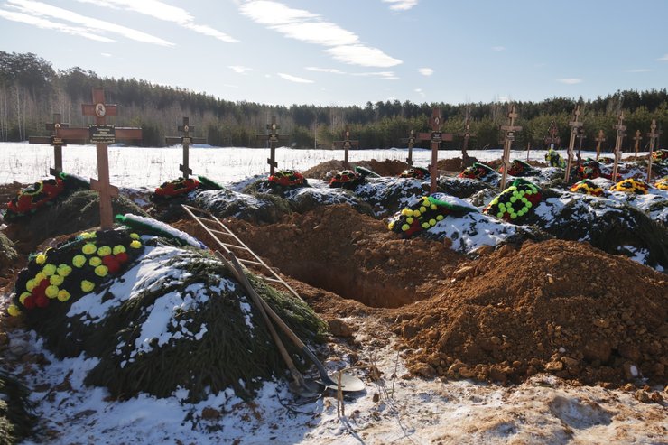 На одному з цвинтарів у Свердловській області, за словами журналістів, для похорону загиблих найманців виділили окремий сектор, де вже налічується 69 могил. Ями для захоронення продовжують викопувати працівники ритуальних служб.