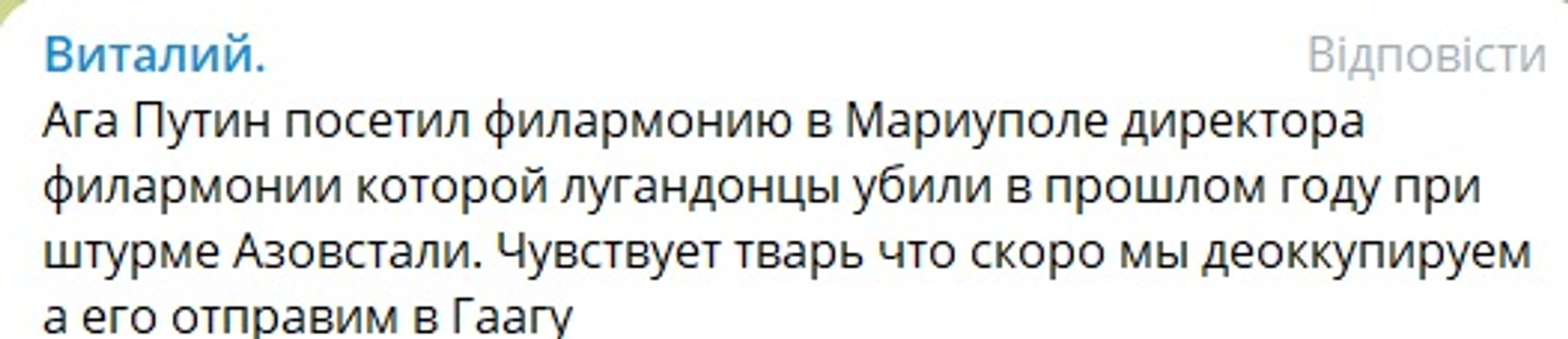 Російський президент Володимир Путін відвідав зруйнований армією РФ Маріуполь і в супроводі віцепрем'єра Марата Хуснулліна оглянув філармонію та навіть поспілкувався з місцевими жителями. Про візит політика повідомили спочатку низка прокремлівських ЗМІ, а потім з'явилася коротка нотатка й на офіційному сайті глави держави.
