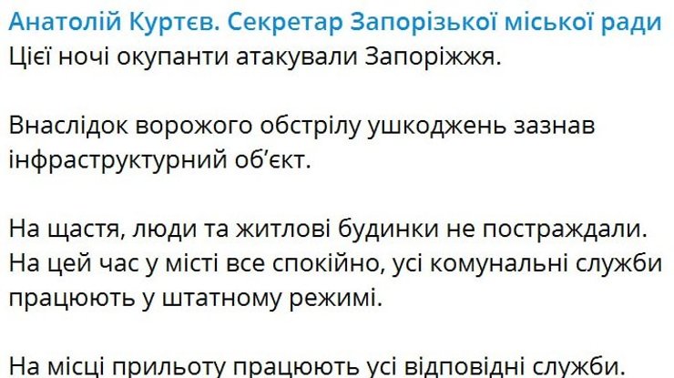 Секретар Запорізької міськради Анатолій Куртєв говорив про ушкодження інфраструктурного об'єкта. Житлові будинки, за його даними, не постраждали.