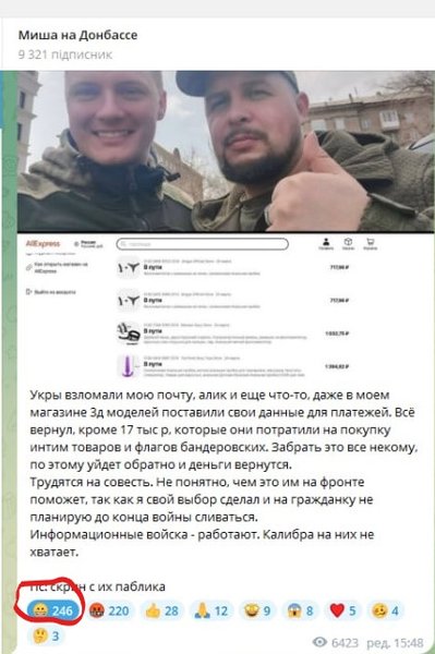 "Укр* зламали мою пошту, алік та ще щось, навіть у моєму магазині 3д-моделей поставили свої дані для платежів. Все повернув, окрім 17 тисяч рублів, які вони витратили на купівлю інтим-товарів та прапорів. Забрати це все нікому, тому піде назад і гроші повернуться. Працюють на совість. Не зрозуміло, чим це їм на фронті допоможе", — написав він.