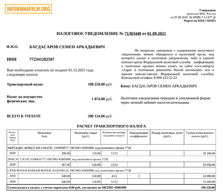 Сам ексдепутат подав декларацію за 2020 рік, в якій офіційно заробив усього трохи більше 265 тис. рублів. А згідно з розрахунком повідомлення йому про сплату податку на транспорт заплатив за рік понад 200 тис. рублів.