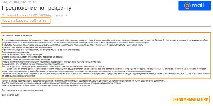 Ексдепутат також активно листується з представниками Африки, шукаючи інвесторів для видобутку олова, танталу та вольфраму в Уганді та ДР Конго, а також для перепродажу в Уганді золота, будівництва нафтосховища та торгівлі паливом.