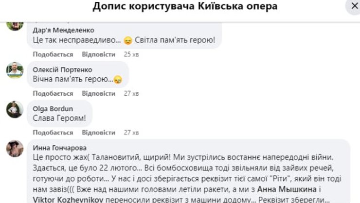 "Талановитий, щирий! Ми зустрілись востаннє напередодні війни. Здається, це було 22 лютого… Всі бомбосховища тоді звільняли від зайвих речей, готуючи до роботи. У нас і досі зберігається реквізит тієї самої "Ріти", який він тоді нам завіз… Реквізит зберегли…", — прокоментувала Інна Гончарова.