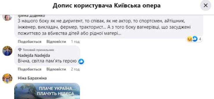 "З нашого боку як не диригент, то співак, як не актор, то спортсмен, айтішник, інженер, викладач, фермер, тракторист… А з того боку вагнерівці, що засуджені довічно за вбивства дітей або рідної матері. Ще одна непоправна втрата для української культури, для нашого театру, зокрема", — написала Ірина Діденко.