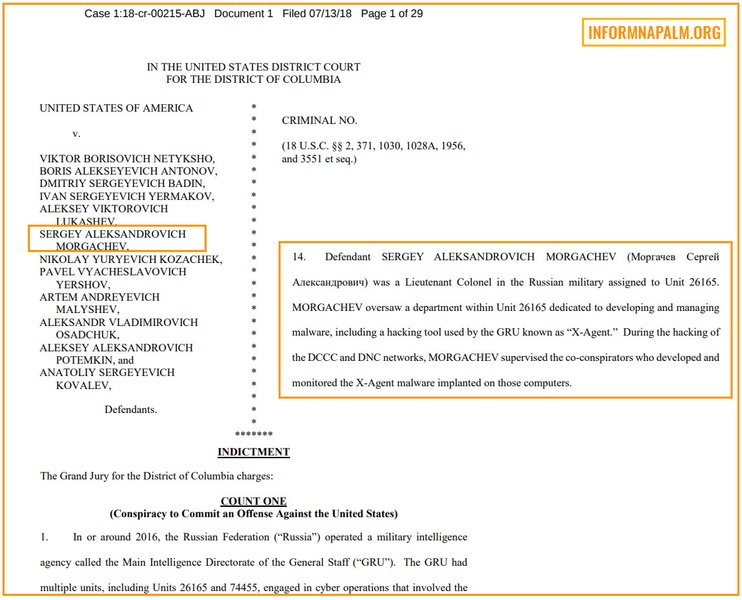 APT 28 — хакерська група, що підпорядковується російській розвідці. Вона відповідальна за кібератаки, спрямовані на урядові та неурядові об’єкти у США, Німеччині, Італії, Латвії, Естонії, Чехії, Польщі, Норвегії, Нідерландах, Україні тощо. Ім’я Моргачева фігурувало в обвинуваченні американського Мін’юсту у зламі серверів Демократичної партії та спробі втручання у вибори. Розслідувачі передають, що на пошті офіцера знайшли лист від Apple про запит Федерального бюро розслідувань США до його даних.