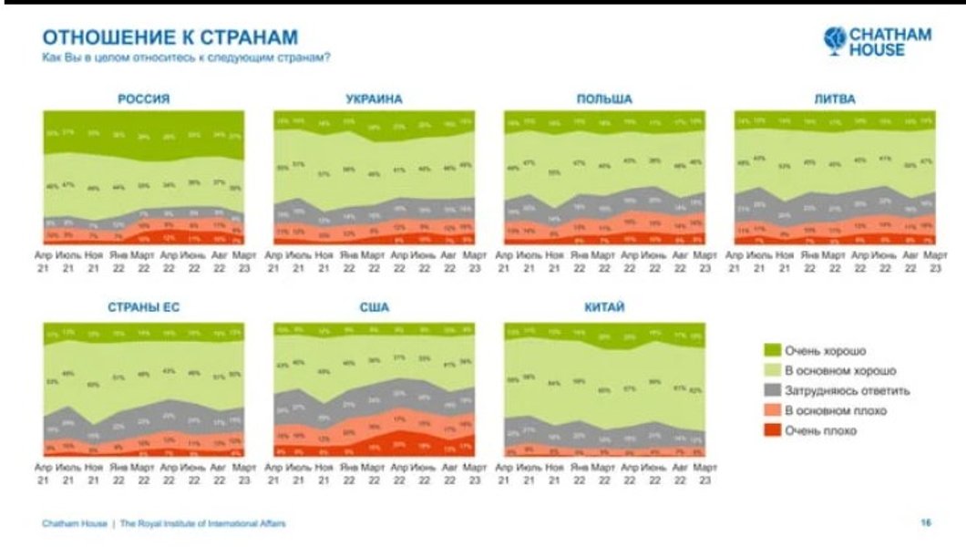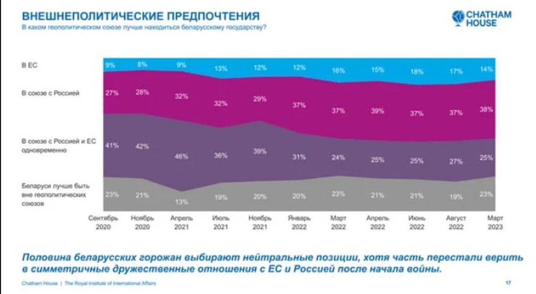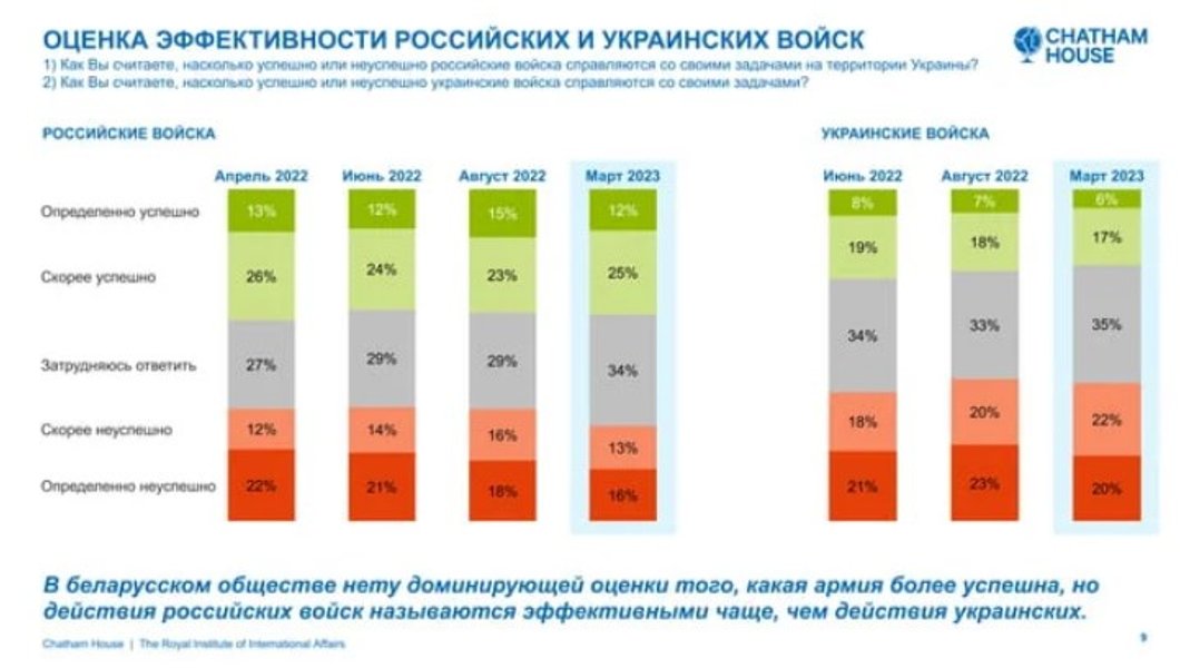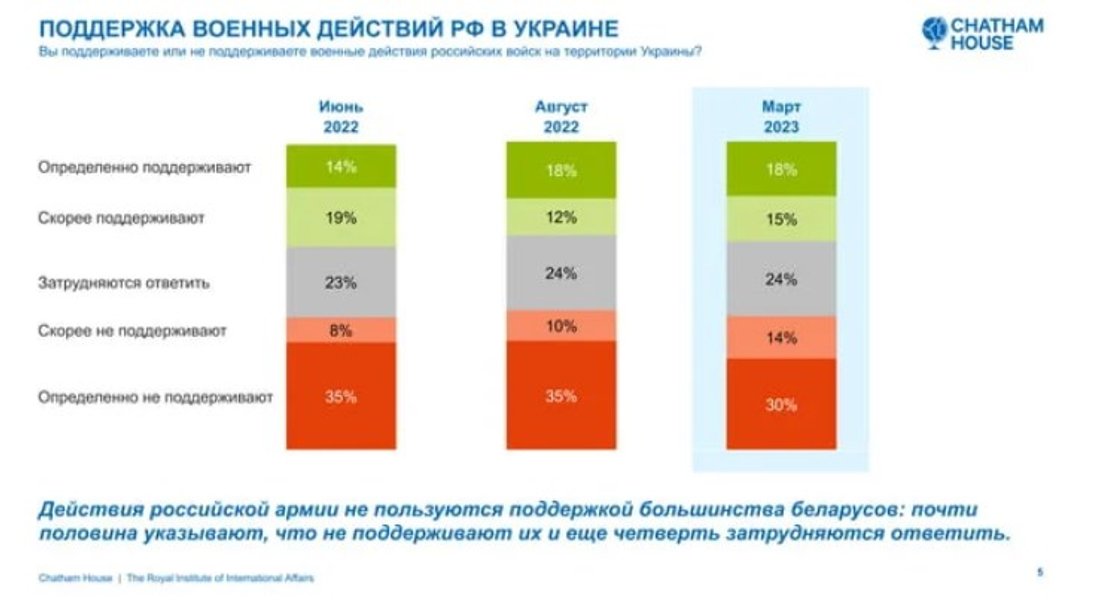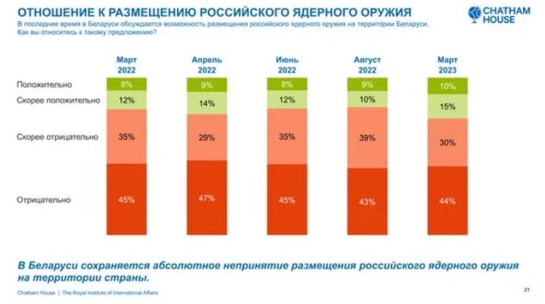 Представники аналітичного центру Chatham House опитали білорусів не тільки щодо ймовірності розміщення ядерної зброї з Росії на території їхньої країни. Результати показали, що у березні 2023 року майже половина респондентів висловилися проти дій російської армії, але приблизно така ж кількість вважає, що Росія у війні переможе.
