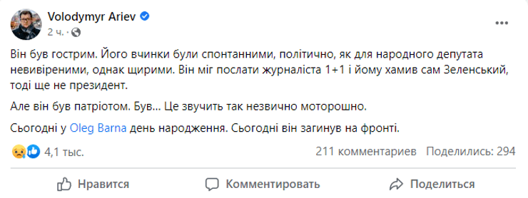 "Він був гострим. Його вчинки були спонтанними, політично, як для народного депутата, невивіреними, але щирими. Він міг послати журналіста "1+1", йому хамив сам Зеленський, тоді ще не президент. Але він був патріотом. Це звучить так надзвичайно моторошно… Сьогодні він загинув на фронті", — написав Ар'єв.