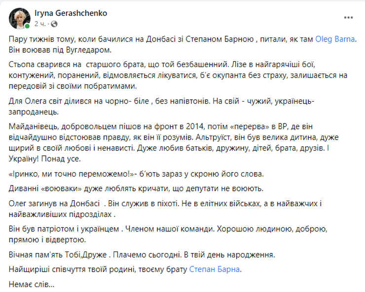 Геращенко повідомила, що кілька тижнів тому вона бачилася на Донбасі зі Степаном Барною (братом військового). На той момент Олег Барна воював під Вугледаром.