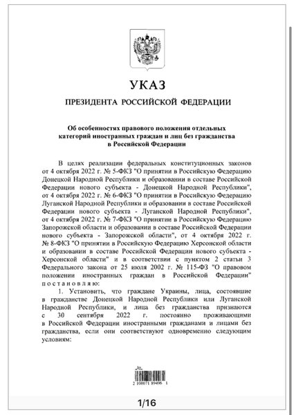 Згідно з указом Путіна "іноземними громадянами" визнаються українці, що постійно проживали у Донецькій, Луганській, Запорізькій та Херсонській областях або проживали раніше та виїхали у Росію. Також "іноземцями" оголосили українців, що захотіли зберегти власне громадянство та не склали присягу громадянина РФ.