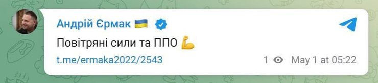 Вже за хвилину в КВДА повідомили про роботу ППО. Цю інформацію також підтвердив очільник Офісу президента України Андрій Єрмак.