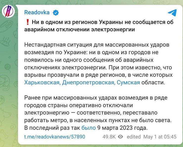 В РФ ракетну атаку по Україні в ніч проти 1 травня в російських пабліках назвали "масованими ударами помсти" і дуже розчарувалися, що в жодному з регіонів України не повідомили про зникнення світла.