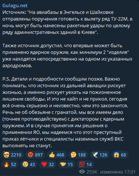 Зазначимо, що раніше, російська правозахисна організація Gulagu.net з посиланням на свої джерела повідомляла, що на російські авіабази в Енгельсі та Шайківці нібито відправлені доручення готувати до вильоту ряд ТУ-22М, в ніч можуть бути завдані ракетні удари по цілій низці адміністративних будівель в Києві.