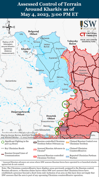 За повідомленням аналітиків Інституту, 4 травня ЗС РФ не досягли жодних підтверджених успіхів у Бахмуті та його околицях.