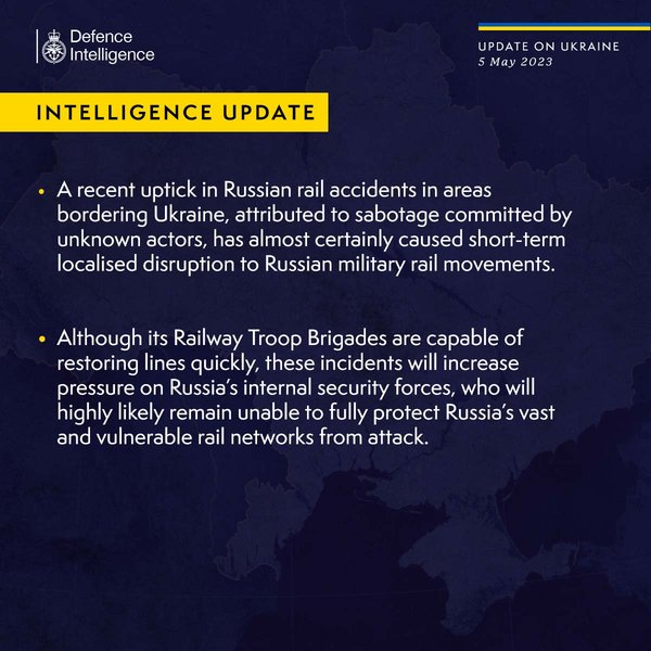 Російська Федерація не має можливості захистити великі і вразливі вузли залізниці від дій диверсантів. Це загрожує регулярними затримками постачання армії РФ. Про це йдеться у розвідці Міністерства оборони Великобританії від 5 травня.