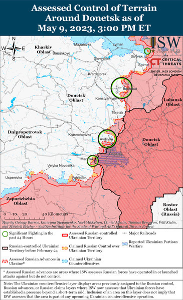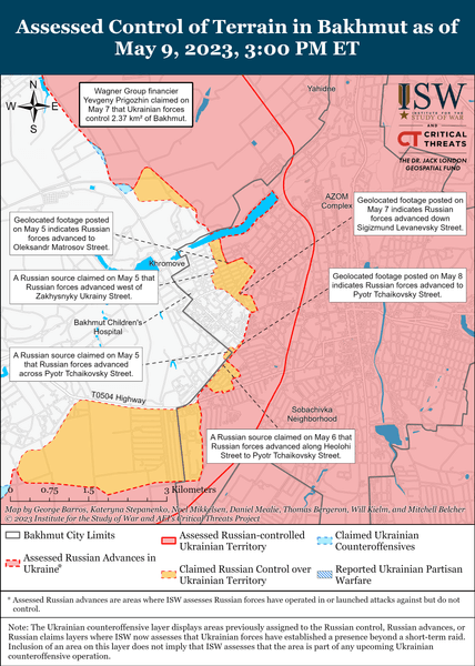 Власник ПВК "Вагнер" Євген Пригожин заявив 8 травня, що його найманці просунулися на 130 м у Бахмуті і що українські сили наразі контролюють 2,36 кв. км міста. У той же день, 9 травня, Пригожин і російські джерела стверджували, що українські сили завдали удару з HIMARS по тюремній установі, яка перебуває під керуванням "Вагнера", неподалік від Бахмута. Примітно, що ISW не виявили візуального підтвердження цього твердження.