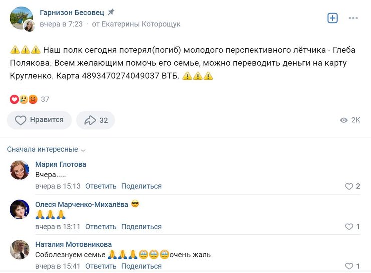 Пізніше в спільноті розмістили інформацію про ще одного загиблого російського льотчика. Ним став пілот 159-й винищувального авіаційного полку 6-ї армії ВПС/ППО ЗС РФ, на озброєнні якого перебувають Су-35, Гліб Поляков.