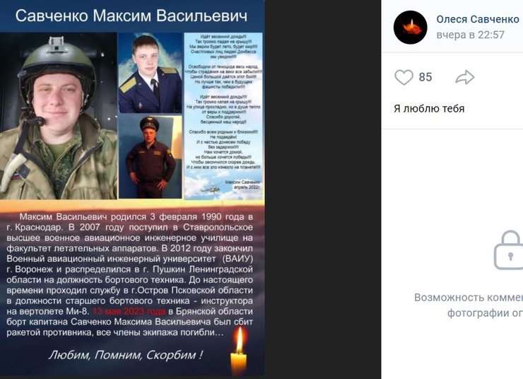 У Telegram-каналі OSINT Georgia оприлюднили некролог одного з льотчиків ЗС РФ — Максима Савченка, пілота гелікоптера Мі-8, який впав на Брянщині. Окупант служив у складі 15-ї бригади армійської авіації Повітряних сил РФ.