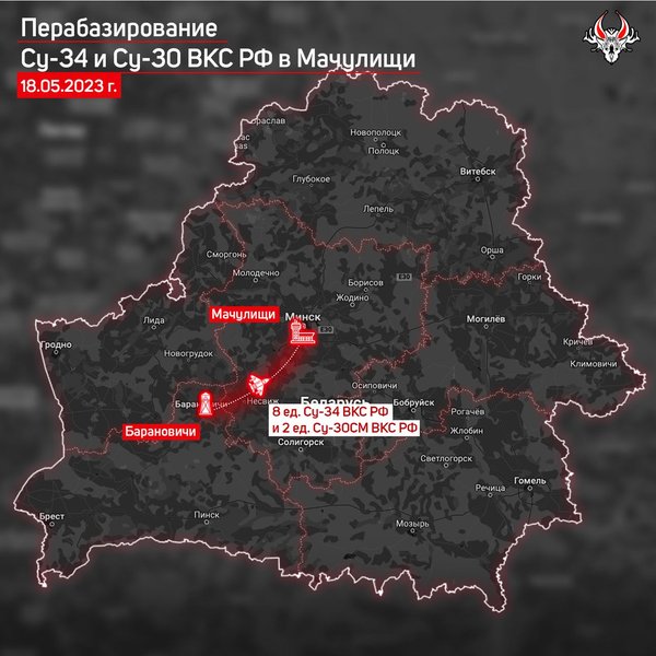 "У Мачулищі перебазовано 10 винищувачів ВКС РФ. У проміжку від 11:20-13:10 18 травня з аеродрому "Барановичі" на аеродром "Мачулищі" перебазували 8 винищувачів Су-34 ВКС РФ і 2 Су-30СМ ВКС РФ", — йдеться в повідомленні.