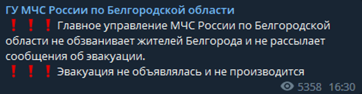 Водночас Головне управління МНС Росії в Бєлгородській області повідомило, що не телефонує жителям Бєлгорода й не розсилає повідомлення про евакуацію.