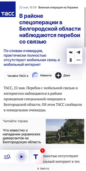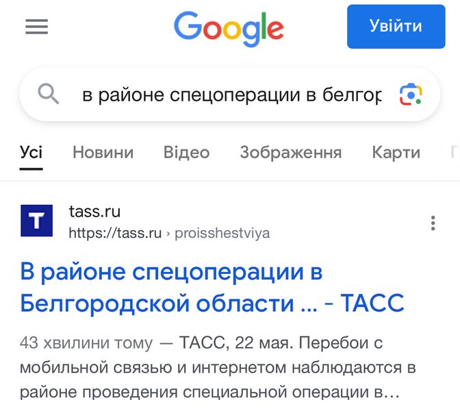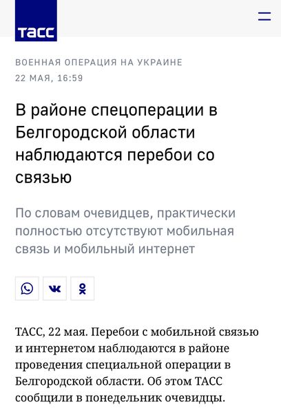 "У районі спецоперації у Білгородській області спостерігаються перебої зі зв'язком", — йдеться у заголовку новини ТАСС.