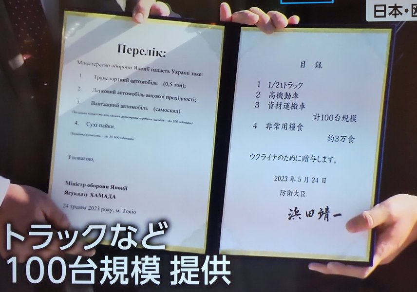 У середу, 24 травня, у Міністерстві оборони Японії пройшла церемонія передачі Україні 100 автомобілів і 30 000 готових харчових пайків для потреб ЗСУ. Проте Японія вперше надала військову допомогу Україні. Про це повідомляє у своєму Facebook посол України у Токіо Сергій Корсунський.