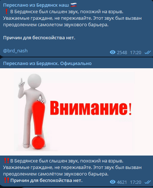 Зазначимо, що декілька проросійських пабліків, які видають себе за місцеві Telegram-канали, повідомили, що насправді нібито не було жодних вибухів, а жителі просто чули, як літак переходить на надзвукову швидкість.