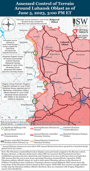 Аналітики ISW зауважили, що не мають візуального підтвердження просування ЗСУ в Бахмуті, пов’язаного з цими обмеженими наступальними операціями 5 червня.
