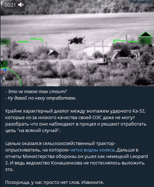 Пізніше в російському Telegram-каналі Fighterbomber, який веде капітан Збройних сил РФ Ілля Туманов, повідомили, що опубліковане МО РФ відео — це торішні кадри об'єктивного контролю з вертольота Ка-52.