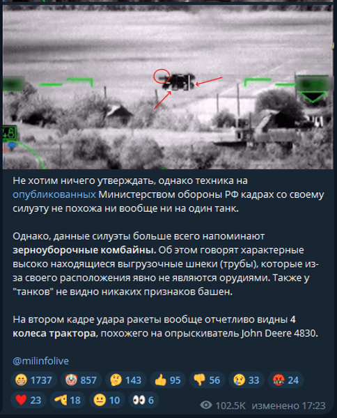 Російські військові оглядачі вказують на те, що у відео, наданому МО РФ, видно силует сільгосптехніки та вивантажувальні шнеки, які складно прийняти за знаряддя бронетехніки. А на одному з кадрів чітко видно чотири колеса.