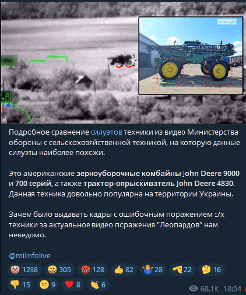 Пізніше автори російського Telegram-каналу з'ясували, що на відео знято знищення зернозбиральних комбайнів John Deere 9000 та 700 серій, а також трактора-обприскувача John Deere 4830.