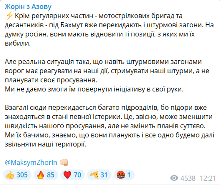 "Крім регулярних частин — мотострілецьких бригад та десантників — під Бахмут вже перекидають штурмові загони. Реальна ситуація така, що навіть штурмовими загонами ворог має реагувати на наші дії — стримувати штурми, а не планувати просування", — поінформував екскомандир.