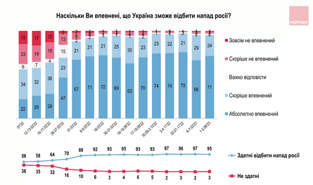 95% респондентів проявили тверду віру у перемогу України. Проте більшість українців, а саме 60%, вважають, що для досягнення перемоги буде потрібний досить тривалий час. Серед них 25% вважають, що знадобиться понад рік, тоді як 37% схиляються до того, що успіху можна досягти за пів року чи рік.